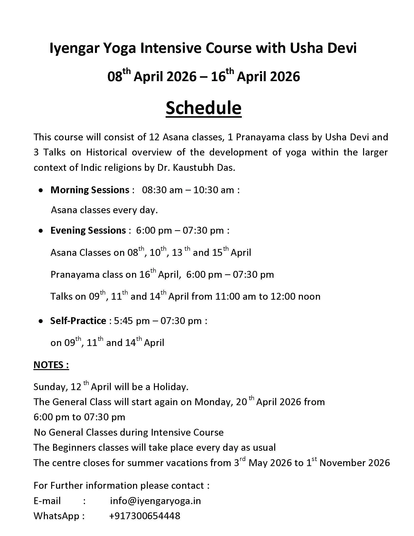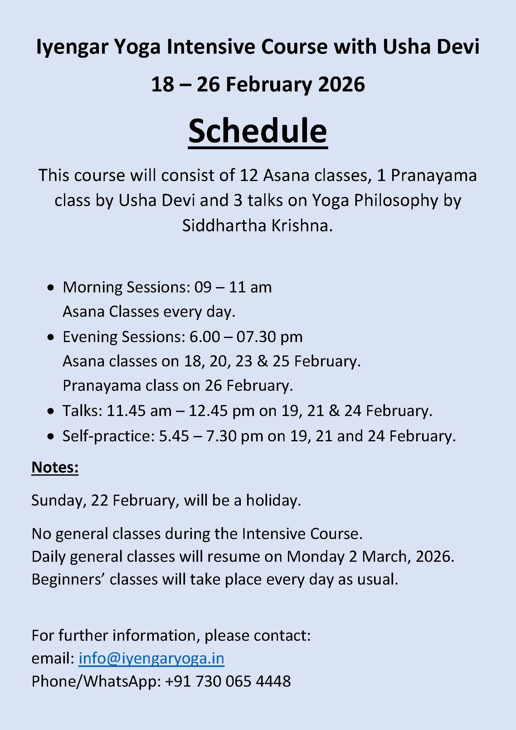 Please contact us through WhatsApp +91 730 0654 448 or email info@iyengaryoga.in for further information.